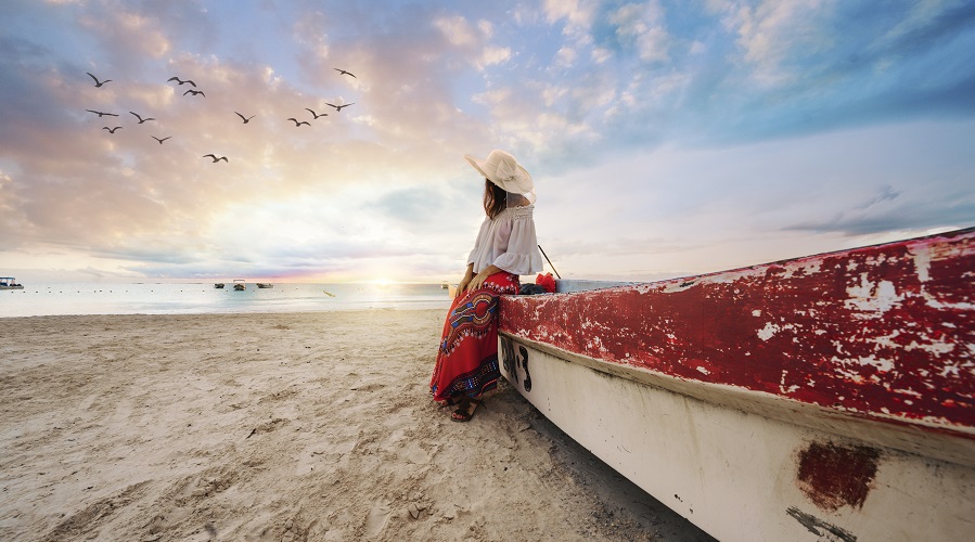 Woman leaning against a boat on a beach at sunset, Tulum, Mexico
